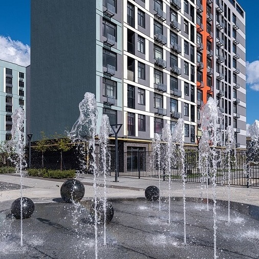 - зона відпочинку та променаду з фонтаном, бігові та велодоріжки